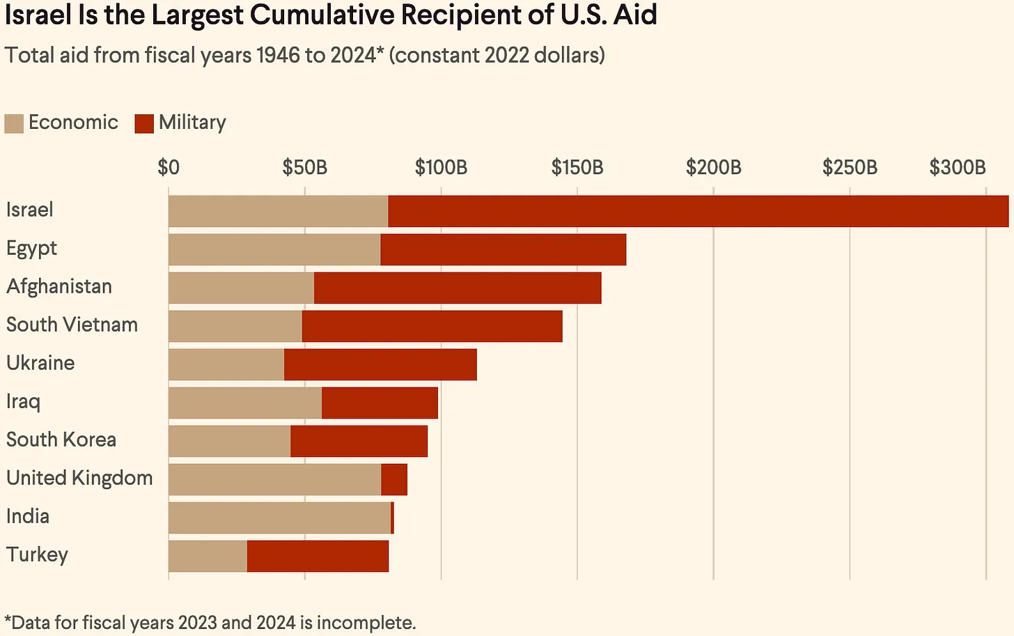 Il y a ensuite l’aide supplémentaire à Israël que le Congrès autorise périodiquement en plus de l’engagement pris dans le cadre du protocole d’accord. Depuis l’invasion d’Israël par le Hamas le 7 octobre, ces suppléments ont largement dépassé l’engagement du protocole d’accord. Au cours de la première année de la guerre à Gaza, le Congrès et le président Biden ont approuvé une aide militaire « d’urgence » supplémentaire de 14,1 milliards de dollars en faveur d’Israël, portant le total pour cette année à 17,9 milliards de dollars.