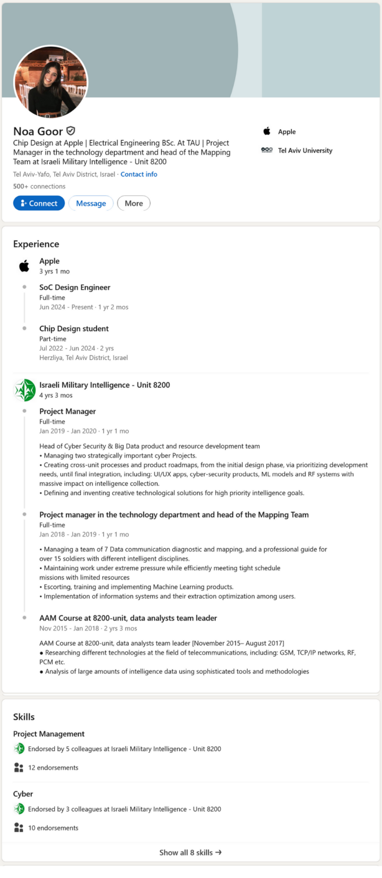 Noa Goor est une autre personnalité de l’Unité 8200 devenue employée d’Apple. De 2015 à 2020, Goor est devenue chef de projet et chef de l’équipe de développement de la cybersécurité et du big data à l’Unité 8200. Selon ses propres termes, elle a « inventé des solutions technologiques créatives pour des objectifs de renseignement hautement prioritaires » et « géré deux projets cybernétiques d’importance stratégique » pour Tsahal.