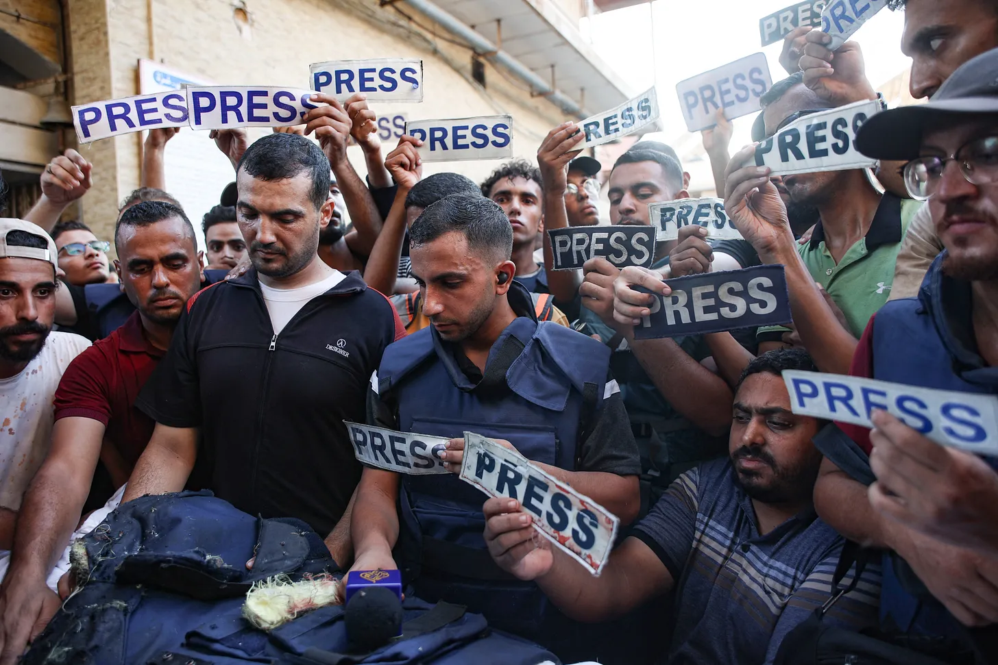 Un peu plus d’une semaine avant l’attentat contre l’école de Tabaeen, Ismail al-Ghoul, ami proche d’Al-Sharif et collègue d’Al-Jazeera, a été tué dans la ville de Gaza lors d’une attaque de drone israélien contre sa voiture, ainsi que son caméraman Rami al-Refee et un jeune homme de 17 ans qui faisait du vélo à proximité. Al-Ghoul a été décapité lors de la frappe. En signe de protestation, les journalistes de Gaza ont jeté leurs gilets pare-balles en tas sur le sol. Al-Sharif s’est adressé à la foule en brandissant le gilet pare-balles mutilé d’Al-Ghoul, déclarant : « Ce gilet de presse est le gilet dont les institutions mondiales et locales font l’apologie. Ce gilet n’a pas protégé notre collègue Ismail. Il n’a protégé aucun de mes collègues non plus. Comme vous pouvez le voir, le gilet est taché du sang et de la chair d’Ismail. Qu’a fait Ismail ? Qu’a-t-il fait ? Diffuser l’image ? Diffuser la souffrance des gens ? Désolé Ismail, nous continuerons à diffuser le message après toi ».