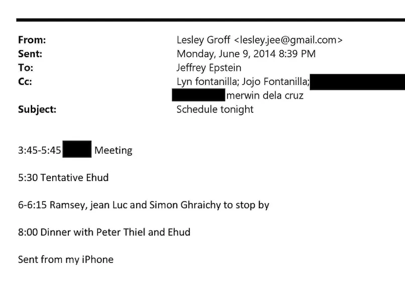 Barak devait prendre la parole à Herzliya le 10 juin 2014 et il prévoyait de rencontrer de Rothschild lors de la conférence. Puis, quelques jours avant le début de la conférence, Epstein a informé Barak d’un dîner de dernière minute avec Peter Thiel le 9 juin, dans son manoir de Manhattan. Barak est resté à New York et a annulé sa rencontre avec de Rothschild en Israël.