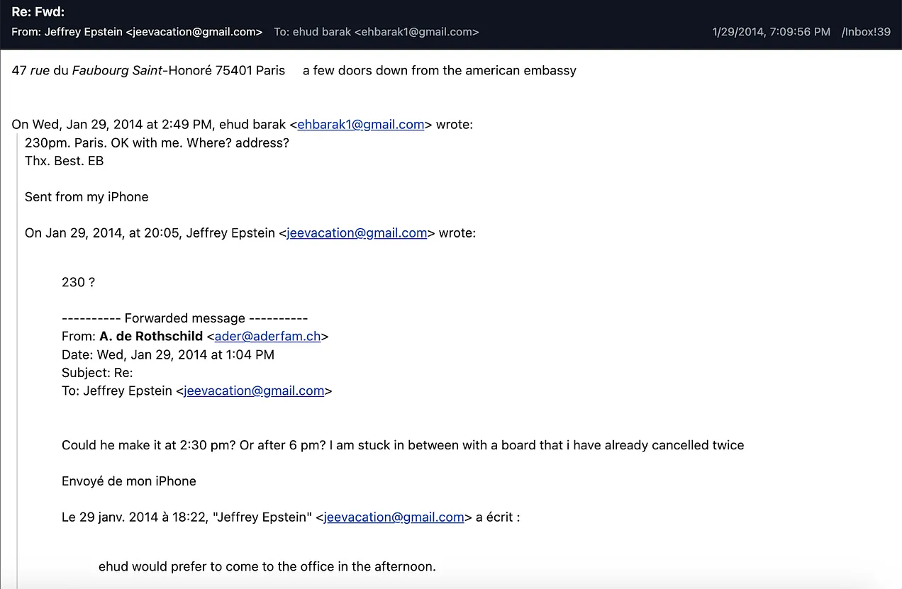 Pendant ce temps, Epstein continuait à entretenir les relations personnelles grandissantes entre Barak et Ariane de Rothschild. Le 30 janvier 2014, Epstein invita Barak à un dîner à Paris avec lui-même, de Rothschild et le président français Nicolas Sarkozy. Epstein lui-même s’est retiré de la réunion peu avant, prétextant un rhume. Mais, signe de son vif intérêt pour la réunion, il a géré toute la logistique par e-mail, organisant finalement la visite de Barak au siège de la banque Rothschild à Paris.
