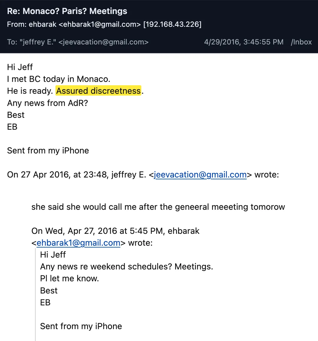 Deux jours plus tard, le 29 avril, Barak a écrit à Epstein : « J’ai rencontré BC [Boris Collardi] aujourd’hui à Monaco. Il est prêt. Discrétion assurée. Des nouvelles d’AdR [Ariane de Rothschild] ? »