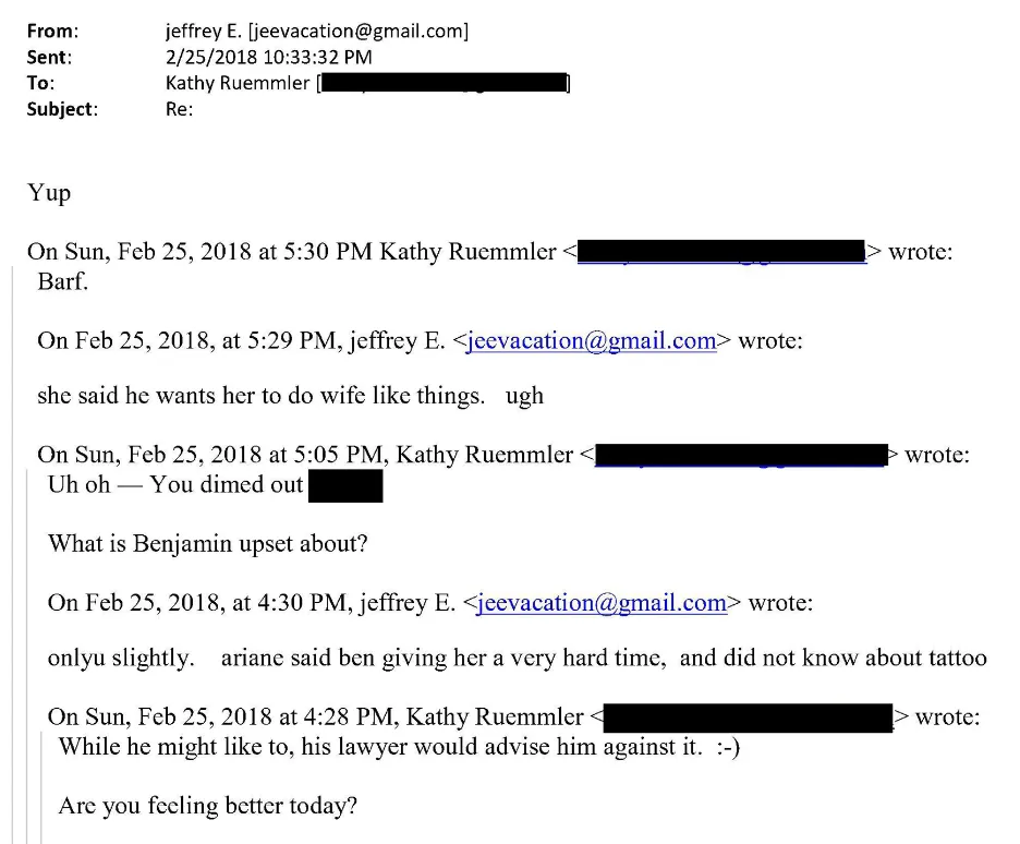 Les divulgations de la Chambre des représentants montrent qu’Epstein et de Rothschild sont restés proches dans les années qui ont précédé la mort d’Epstein. Dans un échange de courriels en 2018 avec l’ancienne conseillère juridique de la Maison Blanche sous Obama, Kathryn Ruemmler, Epstein a colporté des ragots sur les problèmes conjugaux de de Rothschild avec Benjamin de Rothschild, héritier de la fortune Rothschild. Il a écrit à Ruemmler : « Ariane a dit que Ben lui menait la vie dure et qu’il ne savait pas pour le tatouage… Elle a dit qu’il voulait qu’elle se comporte comme une épouse. Beurk. » Ruemmler a répondu : « Beurk. »