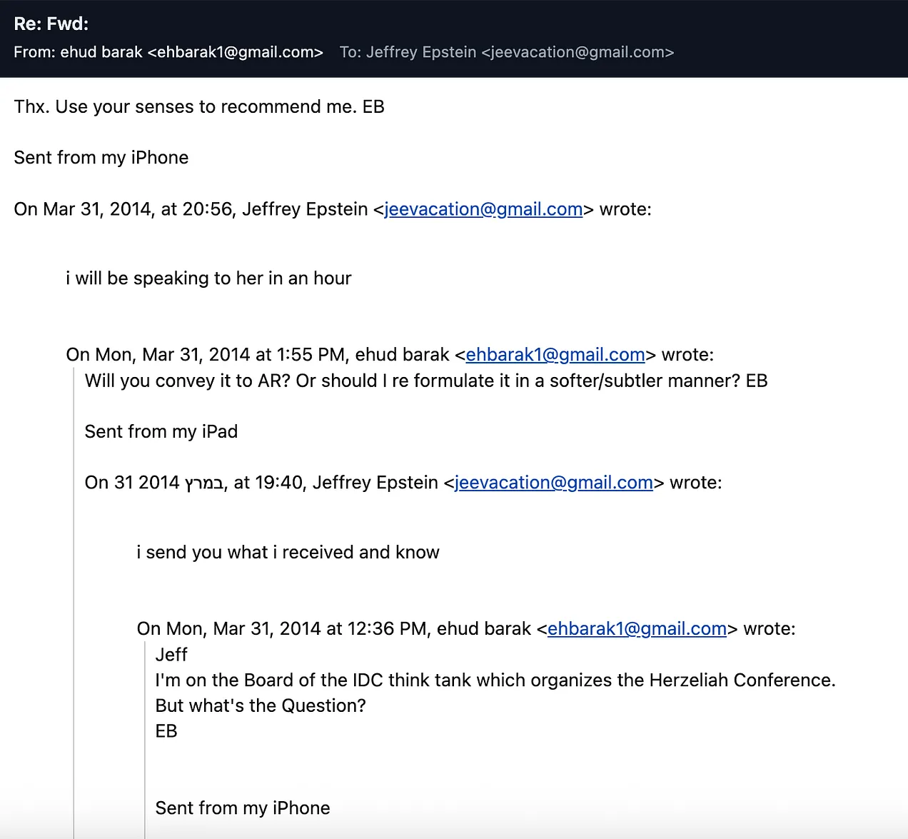 Barak voulait se montrer utile, mais il ne savait pas comment répondre au message de Rothschild concernant les participants à la conférence : « Je siège au conseil d’administration du groupe de réflexion IDC qui organise la conférence Herzeliah (sic). Mais quelle est la question ? » Epstein a répondu : « Je vous envoie ce que j’ai reçu et ce que je sais » et a dit à Barak « Je lui parlerai dans une heure ». Barak a demandé à Epstein de rassembler plus d’informations : « Merci. Utilisez votre bon sens pour me conseiller. » Le lendemain, Barak a communiqué à Epstein la liste des intervenants à la conférence, afin qu’il la transmette à de Rothschild, avec une note : « Veuillez ne pas utiliser ces informations avec d’autres personnes. »