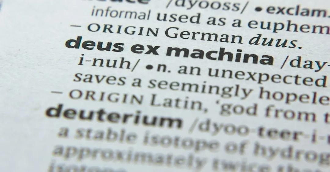 Dans le théâtre grec antique, les pièces se terminaient généralement par l’arrivée des dieux qui punissaient les méchants et récompensaient les héros. Les acteurs incarnant les dieux étaient soit descendus sur scène à l’aide d’une grue, soit hissés par une machine depuis une trappe située en dessous, d’où le terme « deus ex machina ». Aujourd’hui, ce terme est utilisé pour désigner toute résolution paresseuse de l’intrigue où les protagonistes sont sauvés de manière inattendue par une force extérieure plutôt que par le fruit de leurs propres efforts et de leur évolution personnelle ; si les dieux viennent simplement les sauver à la fin, alors rien de ce qu’ils ont fait jusqu’à ce moment-là n’a d’importance, laissant le public insatisfait et fixant le regard sur l’auteur plutôt que sur l’histoire.