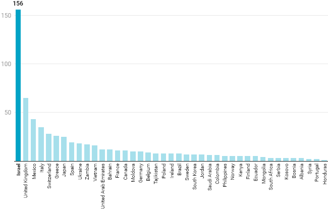 Les voyages offerts sont moins fréquents au Sénat, car celui-ci compte moins de membres et applique des règles plus strictes. Au cours des trois dernières années, Israël a été la destination de près d’un cinquième des voyages internationaux privés parrainés par la chambre haute, soit seuls, soit dans le cadre d’un itinéraire plus large.