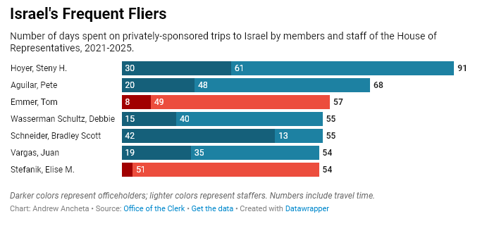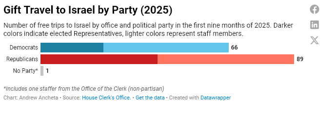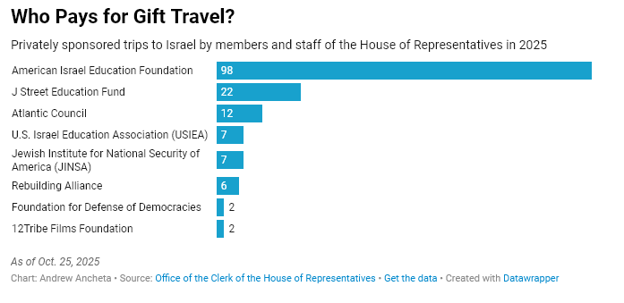 Israël a représenté plus d’un quart des voyages internationaux offerts à ce jour cette année. Les membres de la Chambre des représentants et leur personnel ont accepté 156 invitations en Israël au cours des neuf premiers mois de 2025, dépassant largement les 117 voyages effectués au cours de toute l’année précédente.