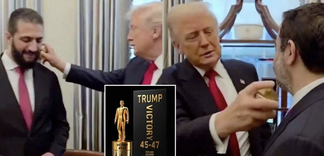 Un an plus tard, la situation semble avoir radicalement changé. Le 15 octobre dernier, le nouveau président syrien s’est rendu à Moscou où il a rencontré son homologue Vladimir Poutine. Trois semaines plus tard, Al Jolani était à la Maison Blanche pour une réunion de travail avec le président Trump. Ces deux rencontres ont suscité une vive controverse compte tenu du passé d’Al Jolani (jusqu’à l’année dernière, sa tête était mise à prix pour 10 millions de dollars en tant que terroriste recherché), mais comme le soupçonnait mon ami Tom Loungo, Al Jolani a probablement été convoqué à Moscou et à Washington pour rencontrer ses nouveaux patrons : « Maintenant, tu travailles pour nous ! » C’est peut-être ce que Trump faisait, à sa manière, lorsqu’il a aspergé Al Jolani et son ministre des Affaires étrangères Al Shibani de son parfum « Victory ».