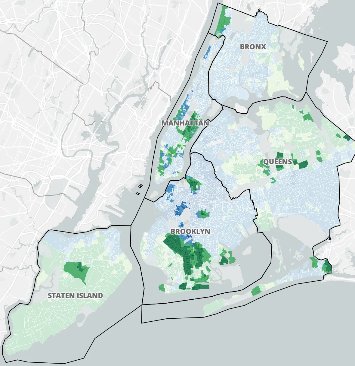 Alors que la classe moyenne juive (non haredi) occupait autrefois une grande partie des quartiers périphériques, sa présence s’est réduite à une poignée de quartiers. Dans le Bronx, d’électeurs juifs de Spuyten Duyvil, une autre communauté de coopératives de trente étages le long de l’Hudson, Cuomo et Mamdani se sont partagé la plupart des voix. Cuomo a néanmoins obtenu de bien meilleurs résultats que Mamdani à Riverdale, où vivent de nombreux juifs orthodoxes, et à Fieldston, une enclave aisée où se côtoient électeurs laïques et orthodoxes. Bien que situées dans le Bronx, ces communautés verdoyantes composées de maisons individuelles partagent certaines caractéristiques culturelles avec le comté voisin de Westchester. Il en va de même dans d’autres quartiers périphériques de la classe moyenne juive remportés par Cuomo, comme Forest Hills dans le Queens. Historiquement, ces quartiers ont oscillé entre la coalition progressiste de gauche de la ville (Lindsay, Dinkins, De Blasio) et la réaction plus centriste (Koch, Guiliani, Bloomberg).