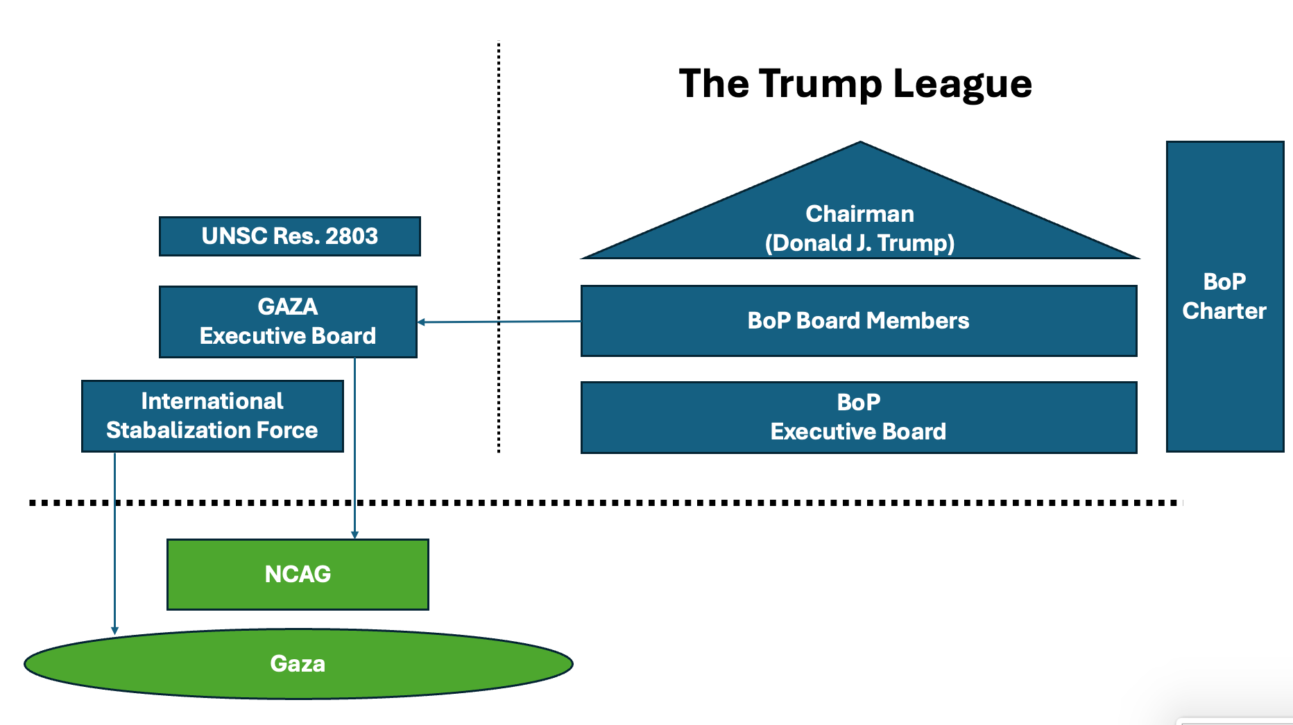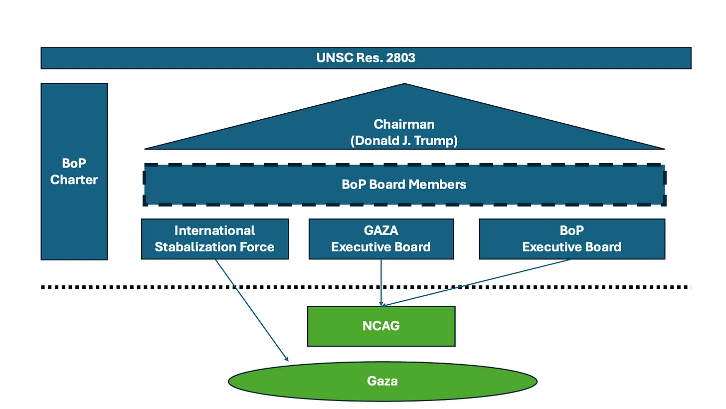 C’est probablement la seule « bonne nouvelle » concernant ce projet, à savoir que le BoP n’est pas conçu pour être une alliance ou une force d’intervention militaire. Le BoP lui-même n’a aucune composante militaire. L’ISF est strictement liée à la résolution 2803 du Conseil de sécurité des Nations unies et non à l’organisation internationale de Trump. Il ne met pas en place sa propre force paramilitaire ou quoi que ce soit de ce genre, du moins pas au niveau international par le biais du BoP. Il est fort probable que Trump tente déjà de séparer le volet Gaza du BoP du reste de l’organisation, car il souhaite l’utiliser à des fins complètement différentes à l’avenir. La structure ressemblera donc probablement bientôt à ceci :