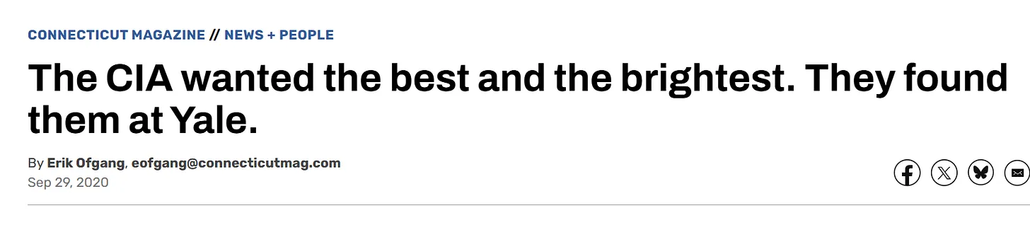 Yale est une institution bien connue pour le recrutement de la CIA, classée juste derrière Georgetown. Elle a été qualifiée de « grande pépinière d’espions ».