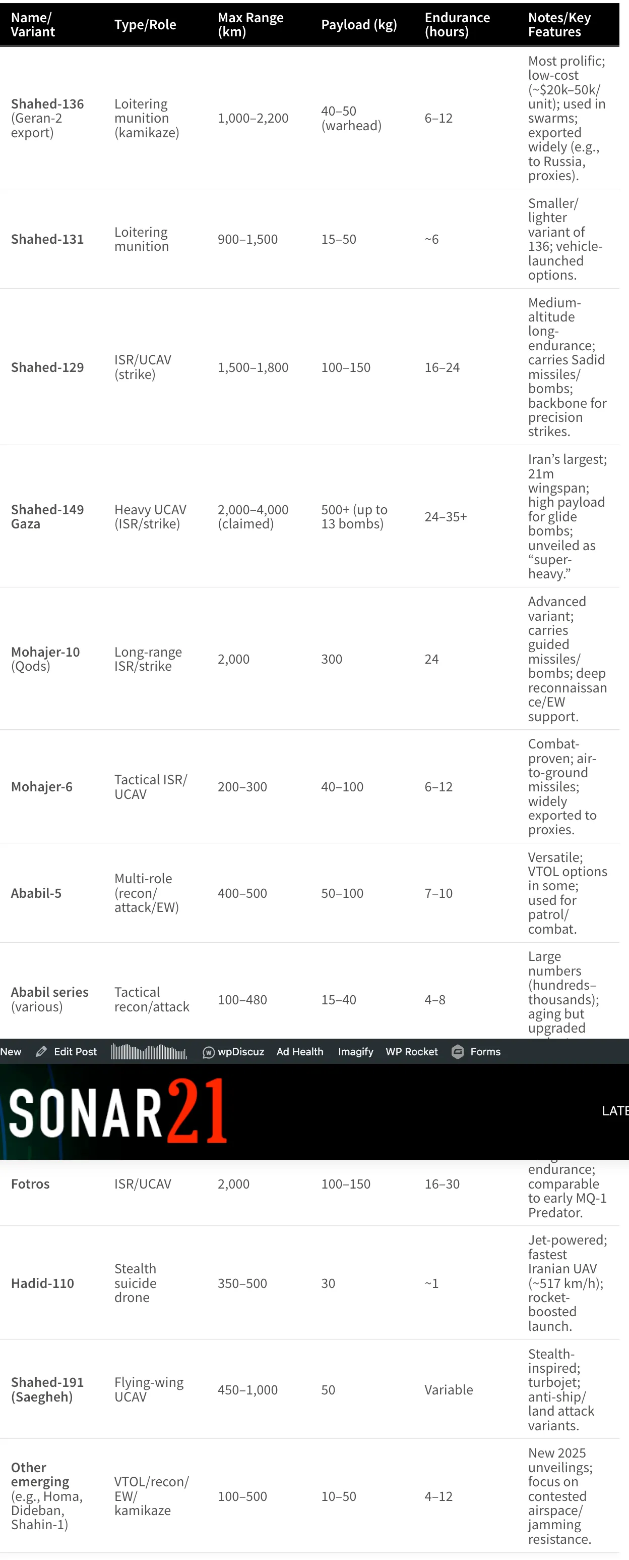 Il existe environ 15 à 20 types/variantes distincts largement utilisés (à l’exclusion des prototypes mineurs ou des versions modifiées par des intermédiaires), et de nouveaux modèles sont régulièrement dévoilés (par exemple, le drone suicide furtif Hadid-110 fin 2025, les VTOL Homa/Dideban/Shahin-1 en 2025). L’accent est mis sur l’endurance, le potentiel d’essaimage et la faible observabilité pour les attaques de saturation.