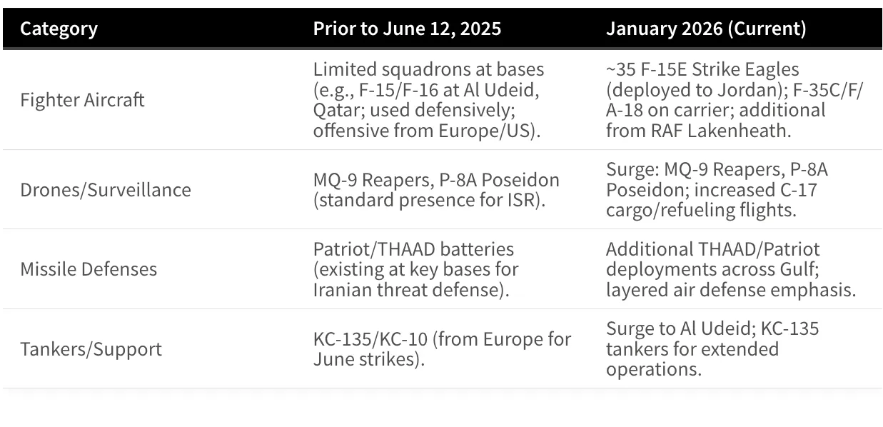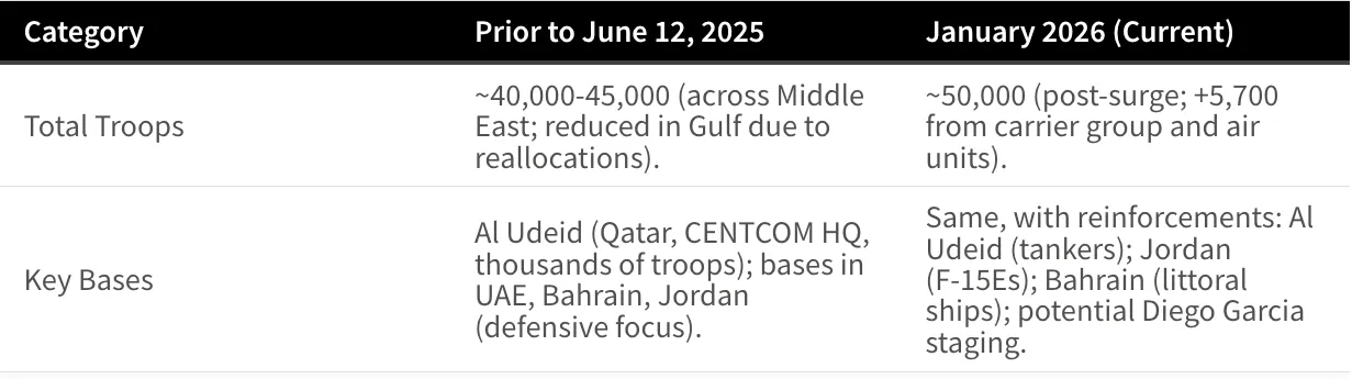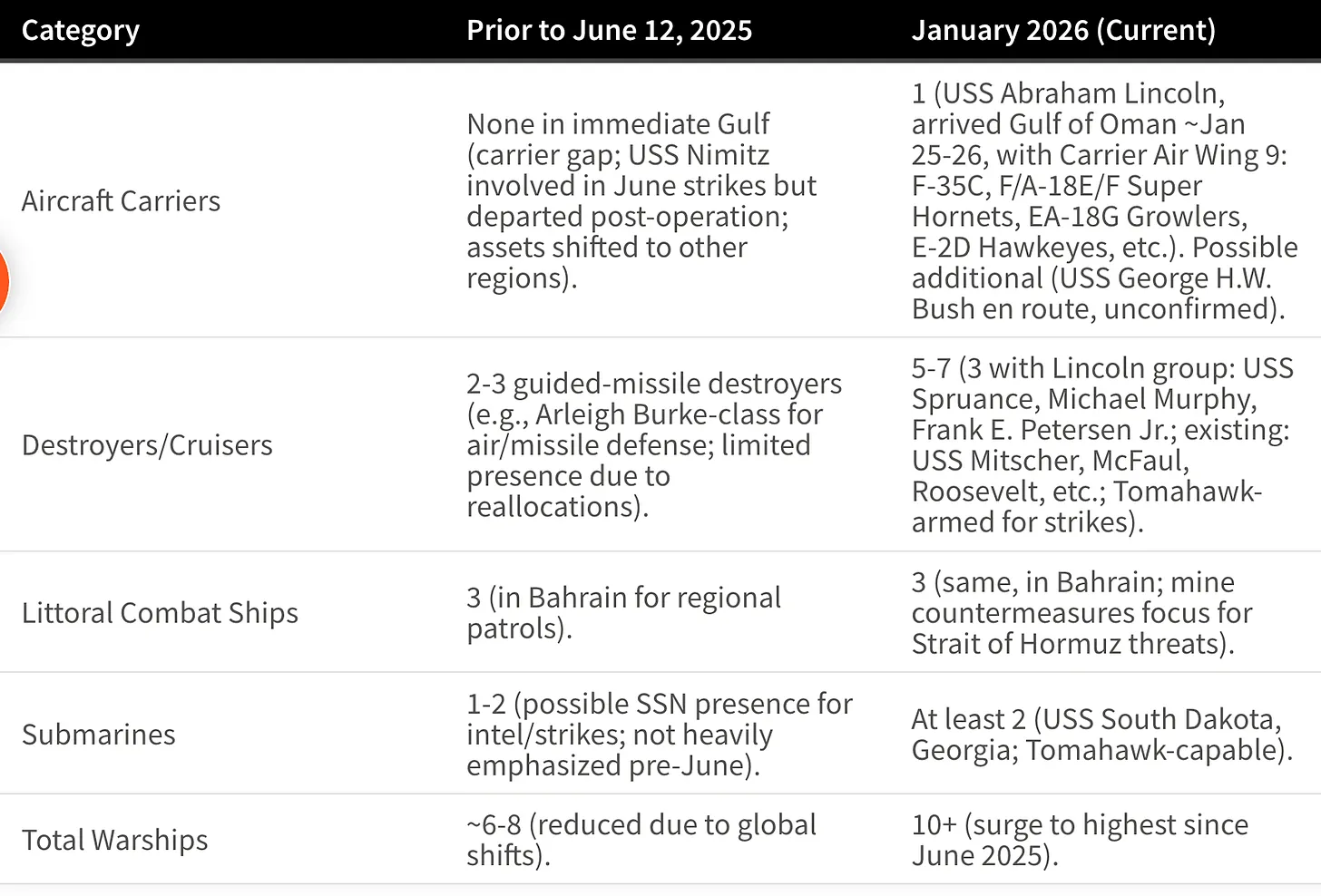 Tableau comparatif : moyens navals américains dans le golfe Persique avant le 12 juin 2025 par rapport à janvier 2026