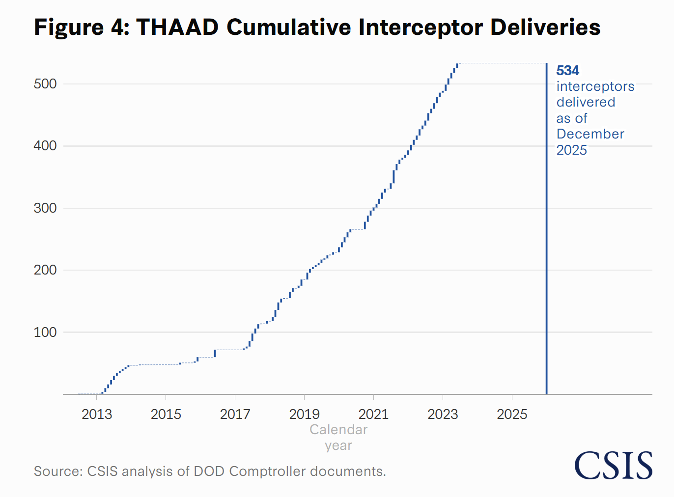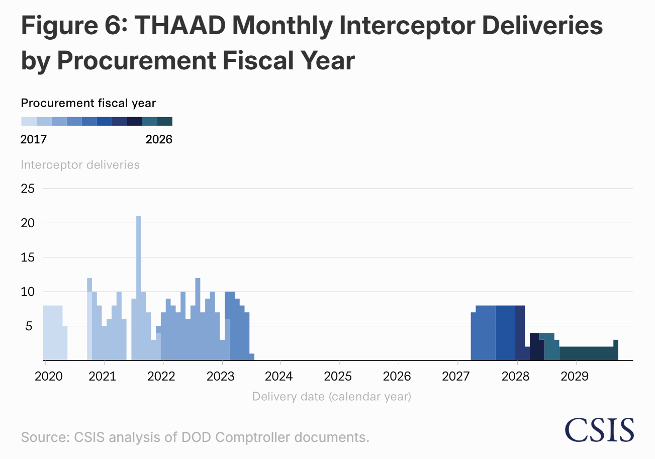 Par ailleurs, la production annuelle d’intercepteurs THAAD est quasi négligeable, aucune livraison n’étant prévue avant mi-2027, et ce à un rythme de production inférieur à 10 par mois :