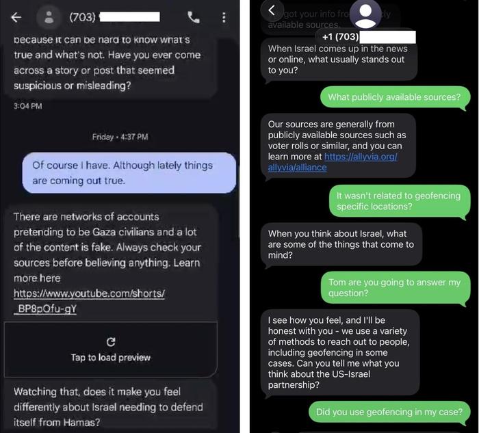 RS a recensé des dizaines d’exemples similaires de SMS pro-israéliens envoyés à partir de quatre numéros différents à des Américains à travers le pays, notamment en Californie, en Floride, au Texas et dans le Wisconsin, parfois même en espagnol. Chantel, une chrétienne sceptique à l’égard d’Israël, a été contactée par « Matt » de Partners in Peace. Comme dans d’autres exemples, Matt a demandé à Chantel où elle obtenait ses informations sur ce qui se passait à Gaza. Chantel a répondu à Matt qu’elle s’informait notamment auprès de PBS et du Guardian, et lui a expliqué comment l’expérience de son père en tant qu’ancien combattant avait façonné son opinion.