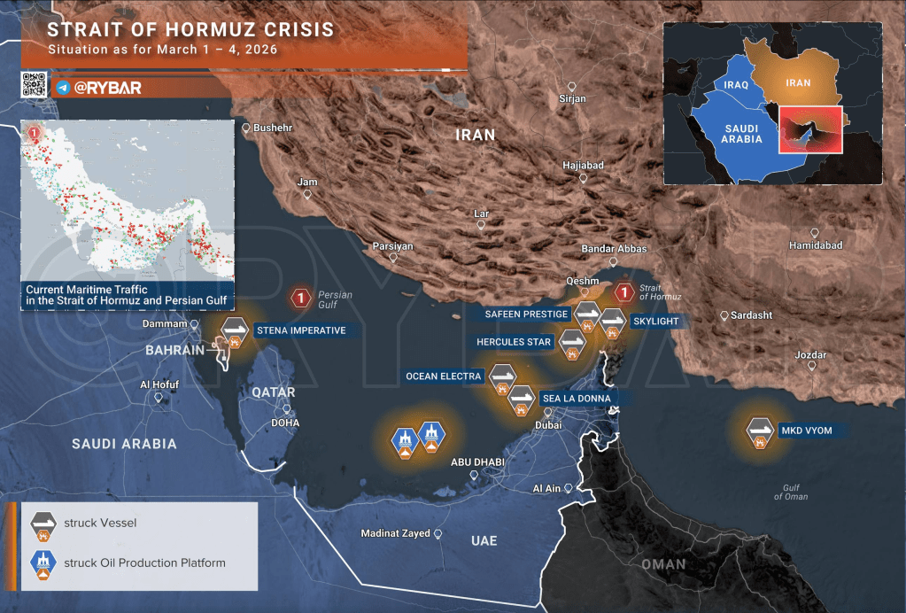 📌À la fin du cinquième jour, le front du conflit s’étendait à toute la région : les bases américaines dans le Golfe sont régulièrement prises pour cible, les mandataires sont devenus plus actifs en Irak et les attaques contre les navires dans le détroit d’Ormuz commencent déjà à perturber la logistique maritime.