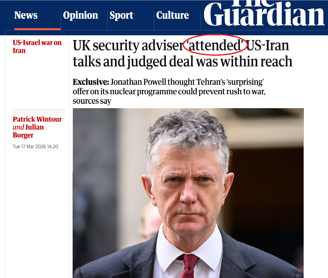 L’article du Guardian consacré à cet événement a été publié le 17 mars, plus de deux semaines après le début de la guerre entre les États-Unis et l’Iran. Si ses auteurs ont pris soin de mettre le mot « assisté » entre guillemets dans le titre de l’article et de ne pas affirmer explicitement que la délégation de Powell avait effectivement joué un rôle dans les pourparlers, leur texte laisse entendre que la délégation britannique a bien joué un rôle.