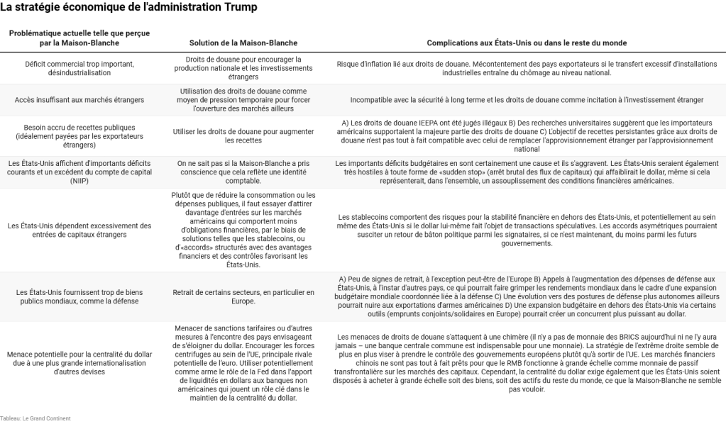 L’administration souhaite obtenir des recettes élevées grâce aux droits de douane payés par les étrangers — ce qui évite toute inflation aux États-Unis — tout en utilisant ces droits pour inciter les exportateurs à délocaliser leurs usines pour les installer sur le territoire états-unien.
