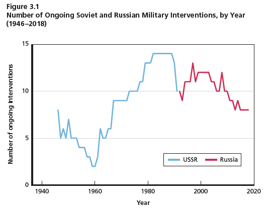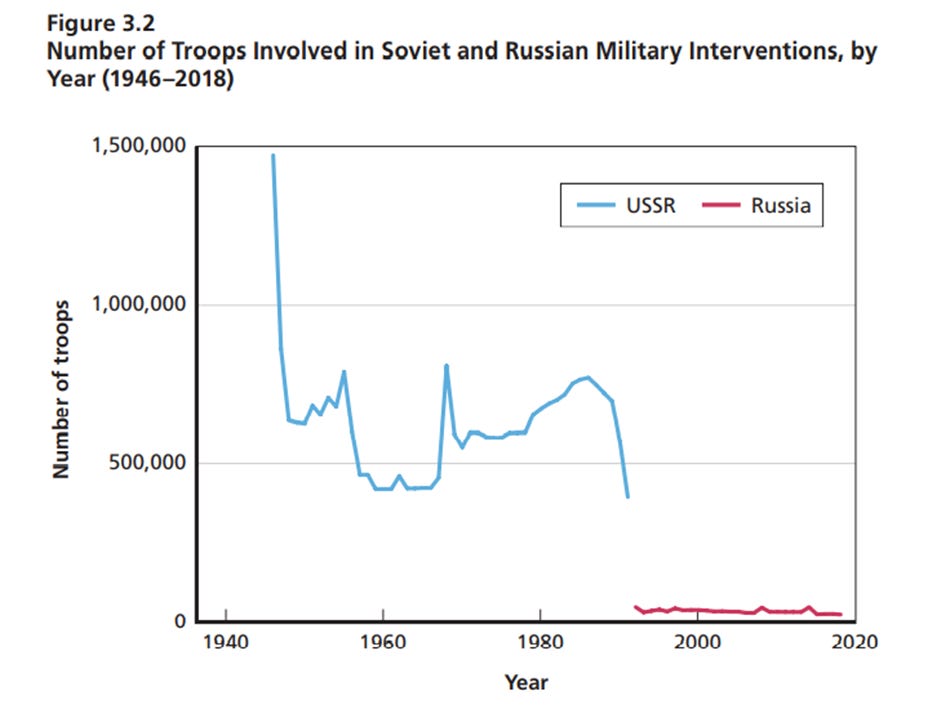 Müller publie et édite désormais Global Bridge, une revue en ligne qui compte de nombreux contributeurs éminents. (Éminents ou non, j’en fais partie.) Cette semaine, il a republié un article paru pour la première fois en 2021. Celui-ci s’appuie sur une étude de la RAND Corporation récemment publiée sous le titre Russia’s Military Interventions: Patterns, Drivers, and Signposts. Le rapport de recherche complet, de 186 pages, est disponible ici. Il regorge de graphiques et de tableaux qui replacent les politiques de sécurité de Moscou dans un contexte historique remontant à 1946, lorsque les Soviétiques se reconstruisaient après les sacrifices considérables que la défaite du Reich leur avait imposés. Il analyse toutes les interventions que les lecteurs connaissent peut-être : l’Afghanistan dans les années 1980, la Géorgie en 2008, la Syrie en 2015. (L’intervention en Ukraine, bien sûr, était encore à venir.)
